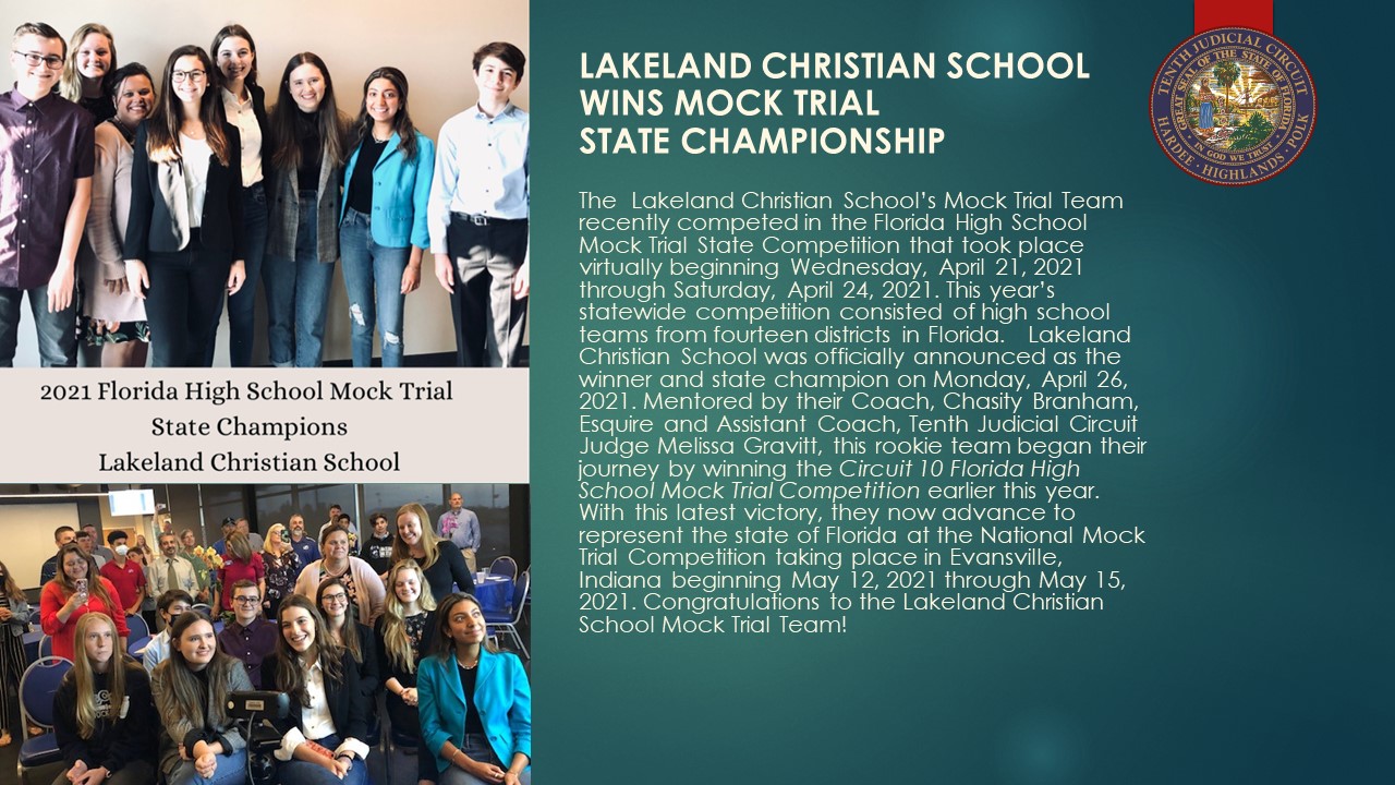 The Lakeland Christian School's Mock Trial Team recently competed in the Florida High School Mock Trial State Competition that took place virtually beginning Wednesday, April 21, 2021 through Saturday, April 24, 2021. This year's statewide competition consisted of high school teams from fourteen districts in Florida. Lakeland Christian School was officially announced as the winner and state champion on Monday, April 26, 2021. Mentored by their Coach, Chasity Branham, Esquire and Assistant Coach, Tenth Judicial Circuit Judge Melissa Gravitt, this rookie team began their journey by winning the Circuit 10 Florida High School Mock Trial Competition earlier this year. With this latest victory, they now advance to represent the state of Florida at the National Mock Trial Competition taking place in Evansville, Indiana beginning May 12, 2021 through May 15, 2021. Congratulations to the Lakeland Christian School Mock Trial Team! To view a larger image, please click here.